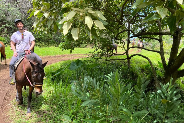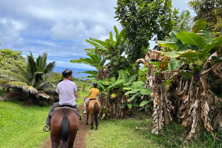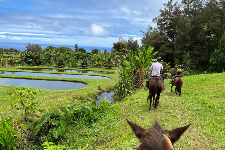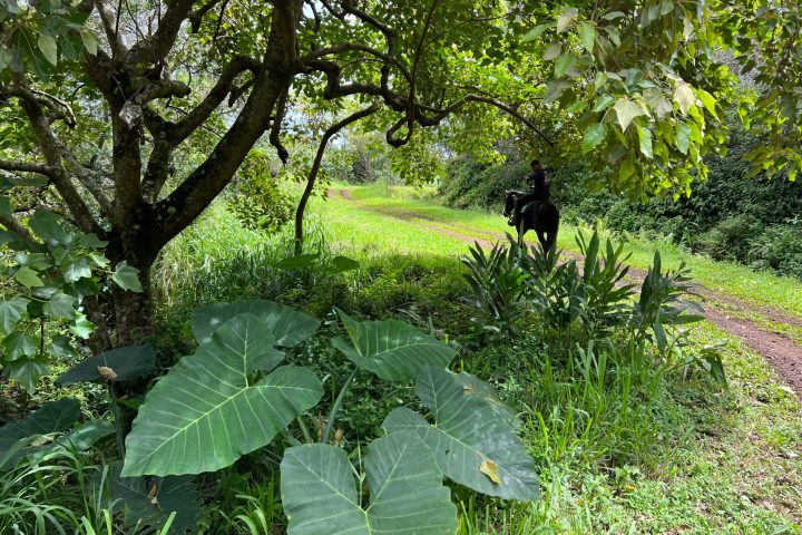 ワイピオ オン ホースバックにチェックイン後、シャトルバスにのって WHO 牧場からワ イピオ渓谷へ移動します。ワイピオ渓谷に到着後、馬に乗り換え ワイピオの約 1.6 キロの 壮大なブラックサンドビーチとハワイ最大級の滝で知られるヒイラベの滝へと進みます。 馬小屋に到着後、乗馬の仕方や気を付ける事などの説明をした後、馬とご対面。 馬に乗った後 ゆっくりと時間をかけて、馬が忘れがたい遠景に導いてくれるでしょう。そ してワイピオの壮大な美しさを堪能することでしょう。乗馬中は私たちガイドが歴史、文化 や伝説についてご説明します。そして地元の収穫物のカロ(タロ畑)、今では珍しいハワイ アンバナナ、サトウキビ、ココナッツやブレッドフルーツ(パンノキの実)等についてもお 話しします。季節によっては蓮の花や、家族の農園でできた季節の果物も見ることが出来ま す。是非、お持ちのカメラで記念写真をお撮りになることをお勧めいたします。